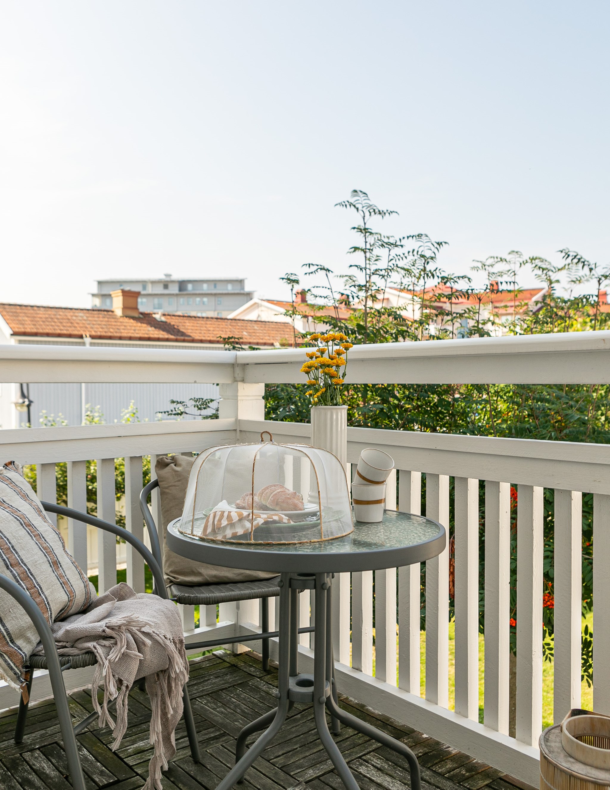 Bara en trappa upp. Men ett litet himmelrike ändå. Mitt i Kålgårdens gamla kvarter, mitt i lugnet, men ändå bara två minuter bort från stadens puls. Två rum i fil mot gränden, sovrummet mot den lugna innergården och parfönster i alla tre rummen. Ett körsbärsträd och ett äppleträd skänker lite skugga om solen är för inställsam. På balkongen har solen fritt tillträde över hustaken från lunch och in mot kvällningen. Detta är livsluft i fin förpackning.