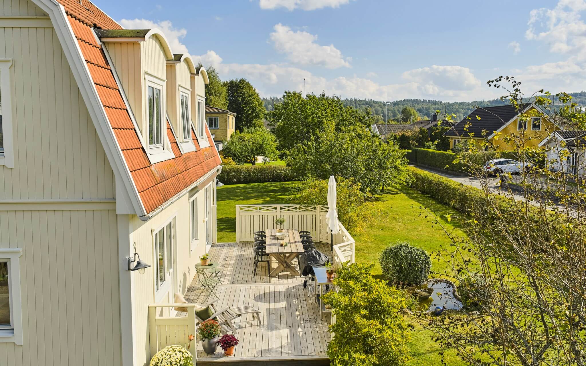 Tomten är stor, grön och lättskött – en mjuk gräsmatta med plats för fotboll, odlingslådor och picknick under träden. Här finns ett helt gäng fruktträd, en liten damm och gott om yta för sommarens lekar. Den långa uppfarten rymmer flera bilar och leder vidare till garaget med extra förvaring. Häckar och träd ger avskildhet mot gatan och kvällarna på söderterrassen blir gärna långa.