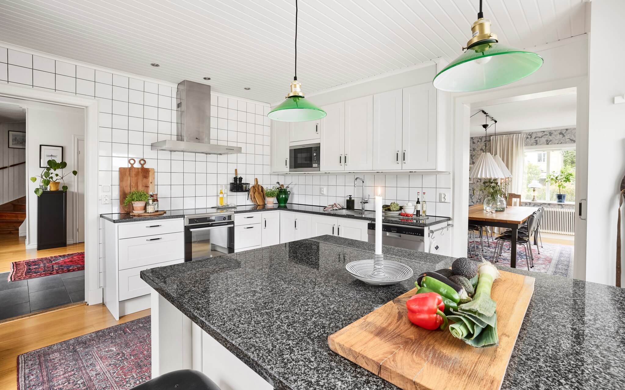 Vardagsrummet har den fina kakelugnen som en varm punkt och sprakar under årets mörka månader. En snyggt mönstrad ekparkett och en generös öppning binder ihop rummet med matsalen. Tillsammans har rummen fönster i flera väderstreck, vilket ger fint ljus från morgon till sen eftermiddag. I matsalen ryms ett rejält matbord, piano (om du vill) och det är högt i tak för samtal. Här, liksom i köket, är det nära ut till terrassen – vilket gör det enkelt att börja middagen ute och sedan flytta in när kvällen blir sval.