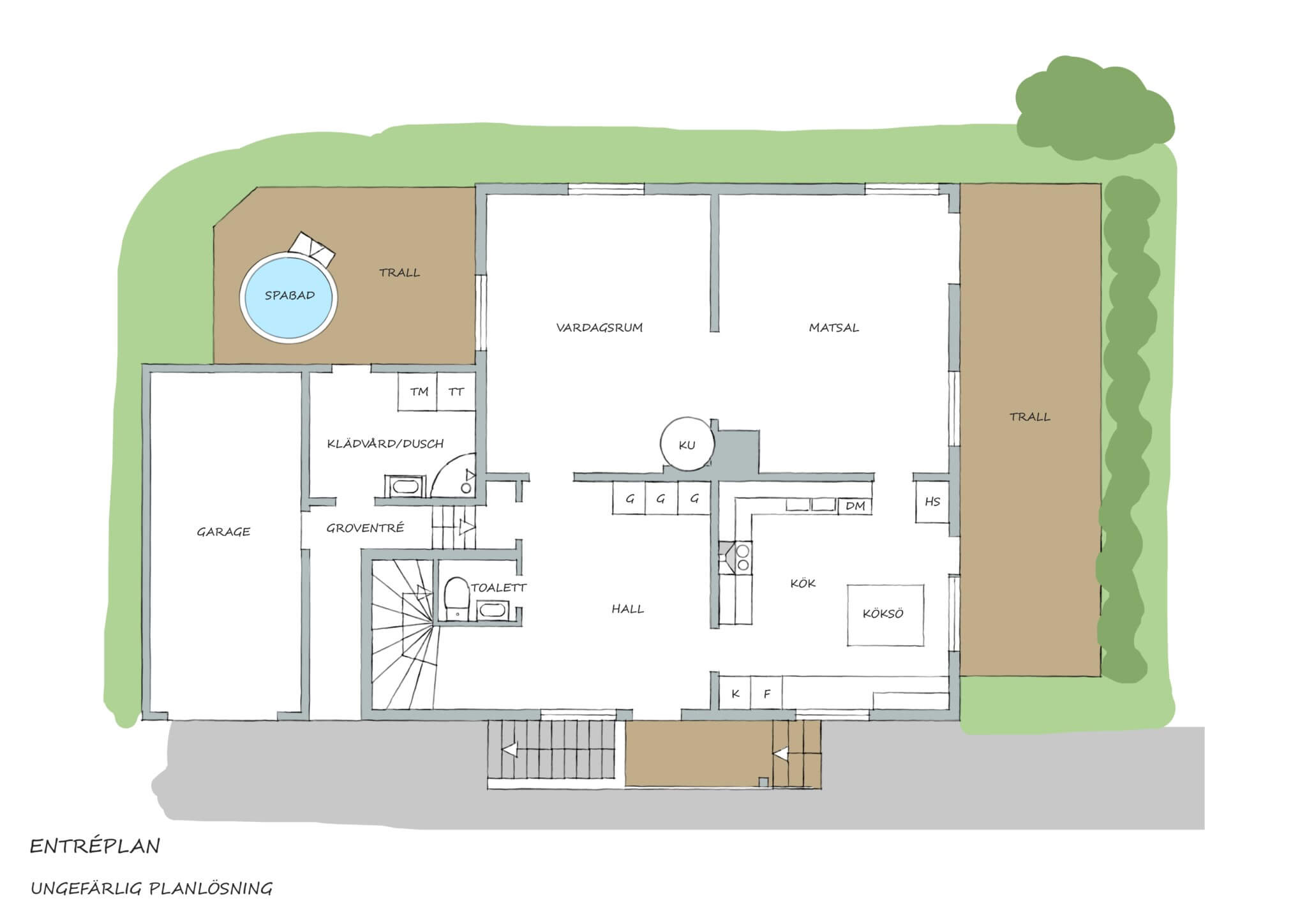 I en utbyggnad mellan huset och garaget ligger groventré och tvättstuga. Generöst och ordningsamt med gott om förvaring för ytterkläder, sport och vardagslogistik. Tvättstugan är ljus och praktisk med extra dusch som gör vardagen smidig efter träning eller trädgård. Härifrån går en egen dörr ut till den östra uteplatsen. Och bara några steg bort står spabadet, perfekt för sena kvällar, stjärnhimlar och varma samtal året om.