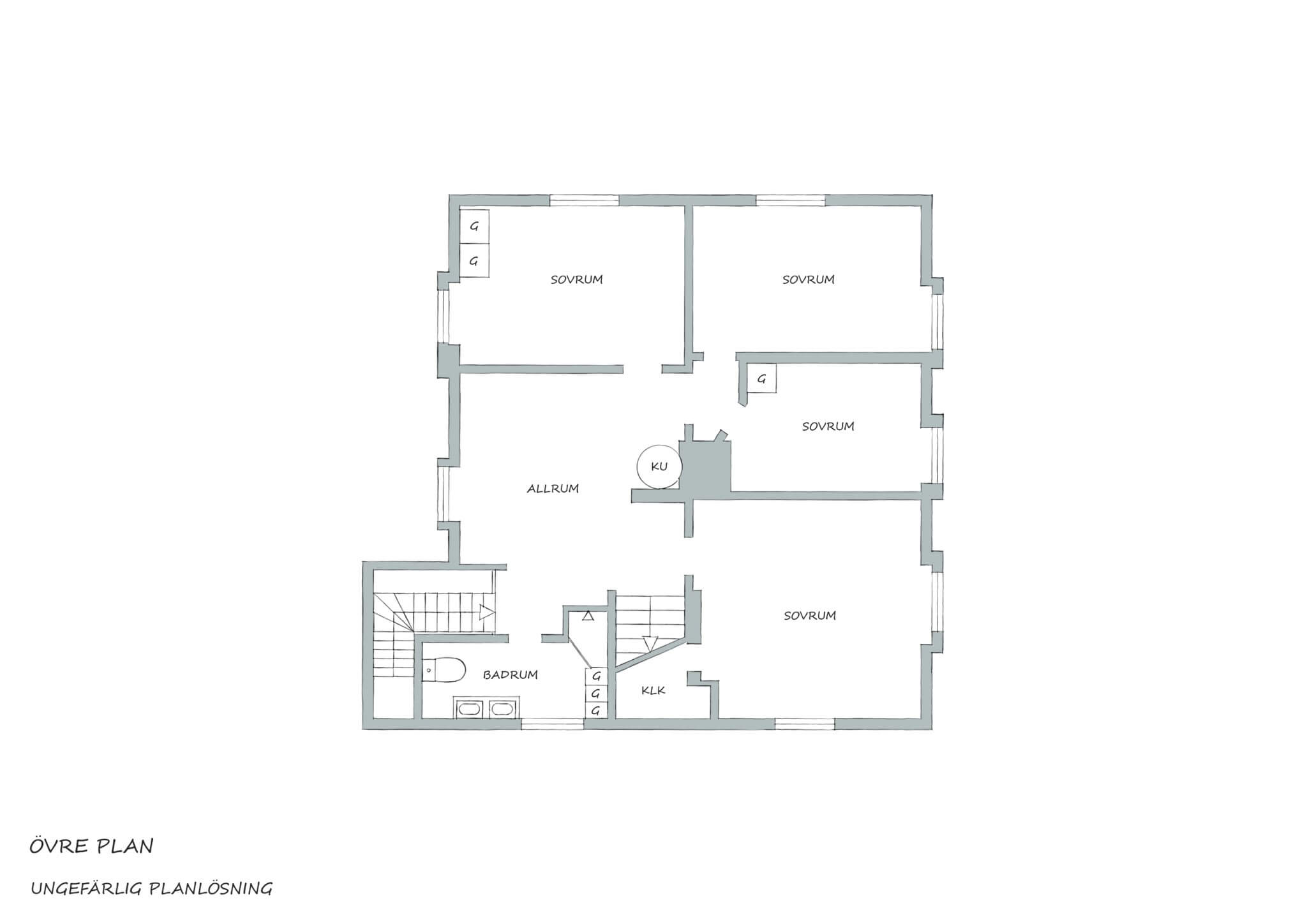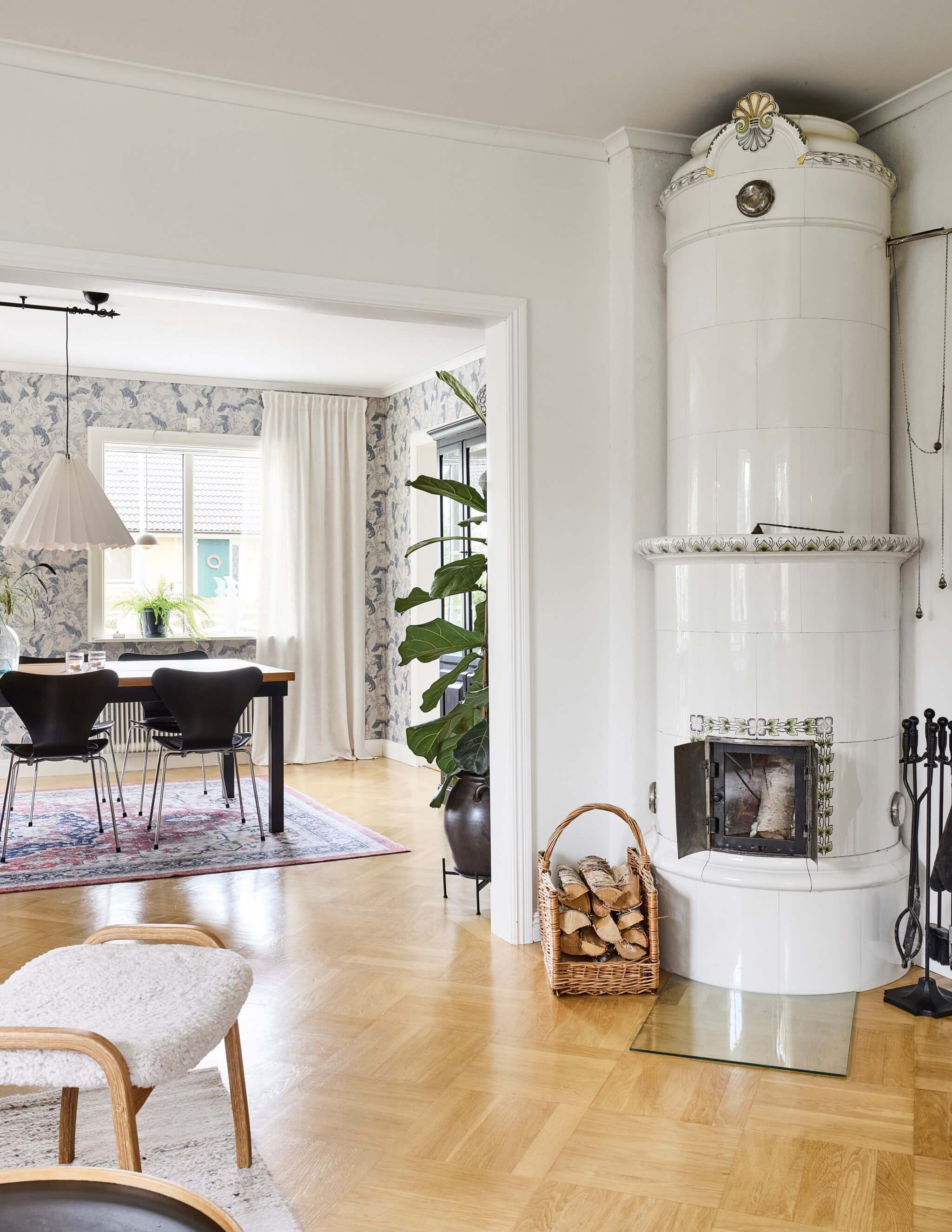 På övre plan väntar ett av husets mest omtyckta rum – ett allrum med vinklar och vrår, fönster mot trädgården och plats för både soffa och skrivbord. Här mellan sovrummen uppstår det där vardagslugnet: läxläsning, filmkvällar, legobyggen och sena samtal. Kakelugnen står kvar som ett vackert smycke i rummet, en påminnelse om svunna tider och hantverkets charm. Tillsammans med det gamla trägolvet skapar den en känsla av hemtrevnad i hela rummet. En naturlig samlingsplats när kvällen landar.