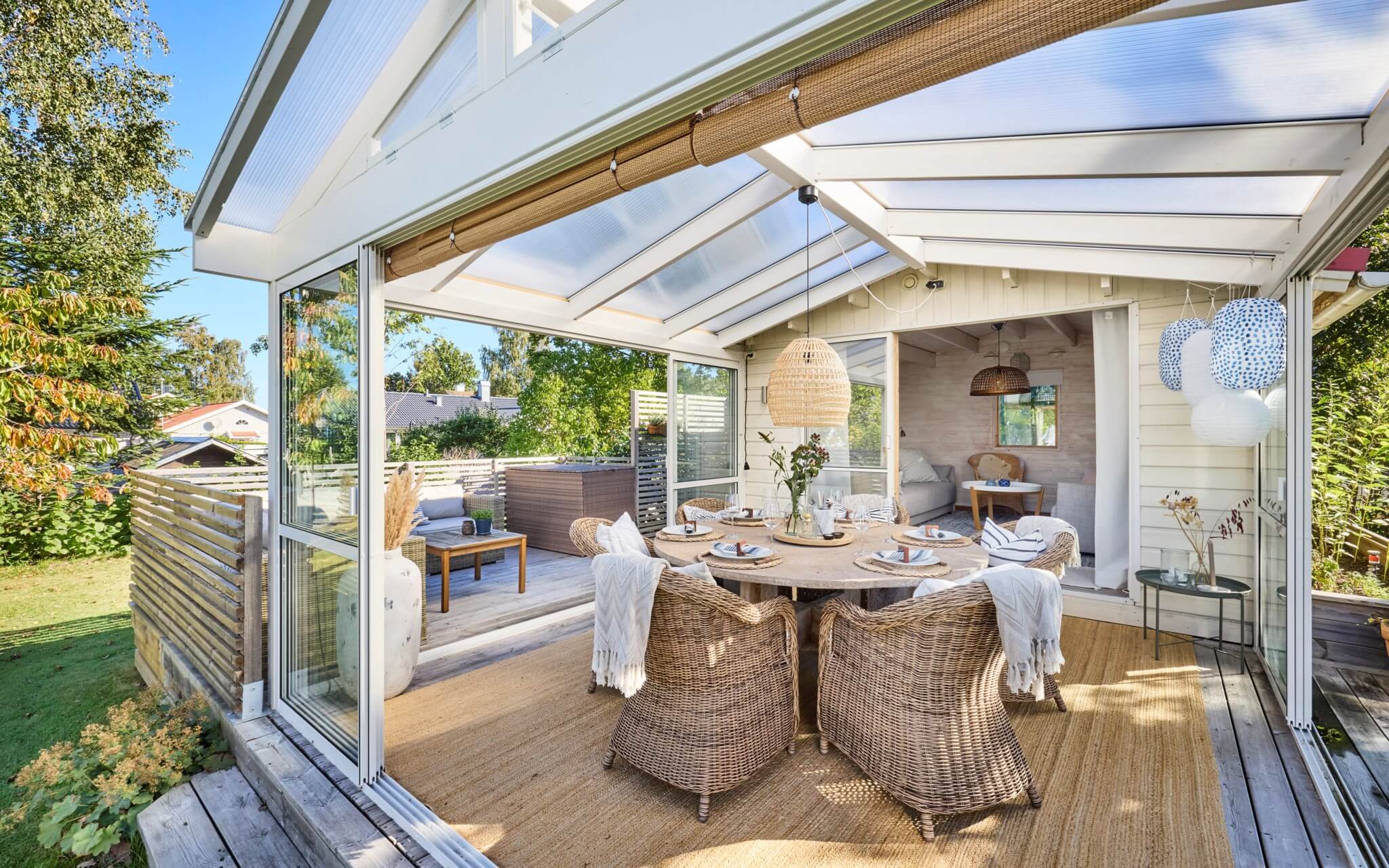 Över uteplatsen från köket och matsalen rör sig solen från morgon till sen eftermiddag, och uterummet på tomten får kvällens sista strålar in på matgruppen.